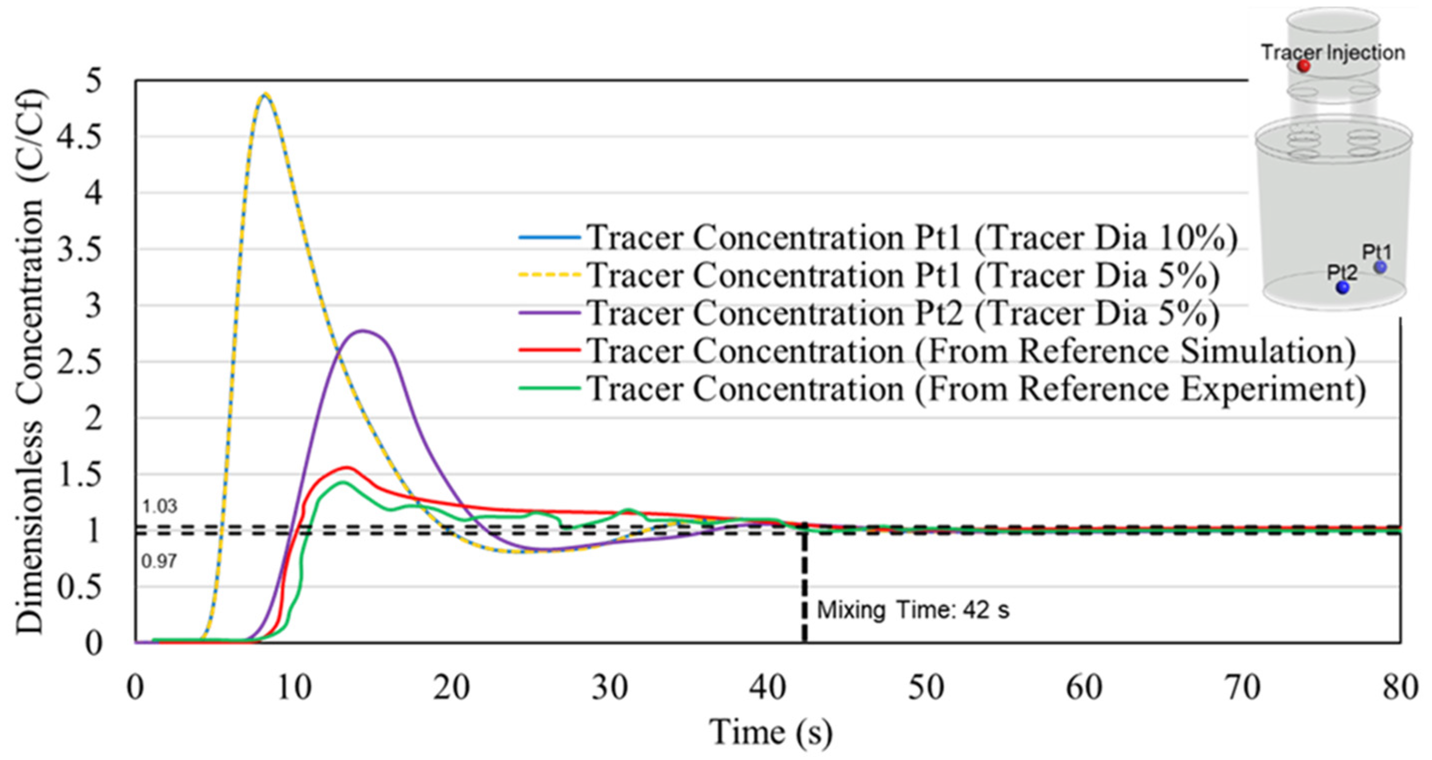 The mixing time was calculated using a dimensionless concentration parameter, defined as the ratio between the instantaneous tracer mass fraction and the tracer mass fraction at saturation. Physically, it represents the degree of homogenization achieved once the system reaches a steady state, with values closer to 1 indicating a higher level of mixing. The mixing time was evaluated when the dimensionless concentration reached ±3% of 1.