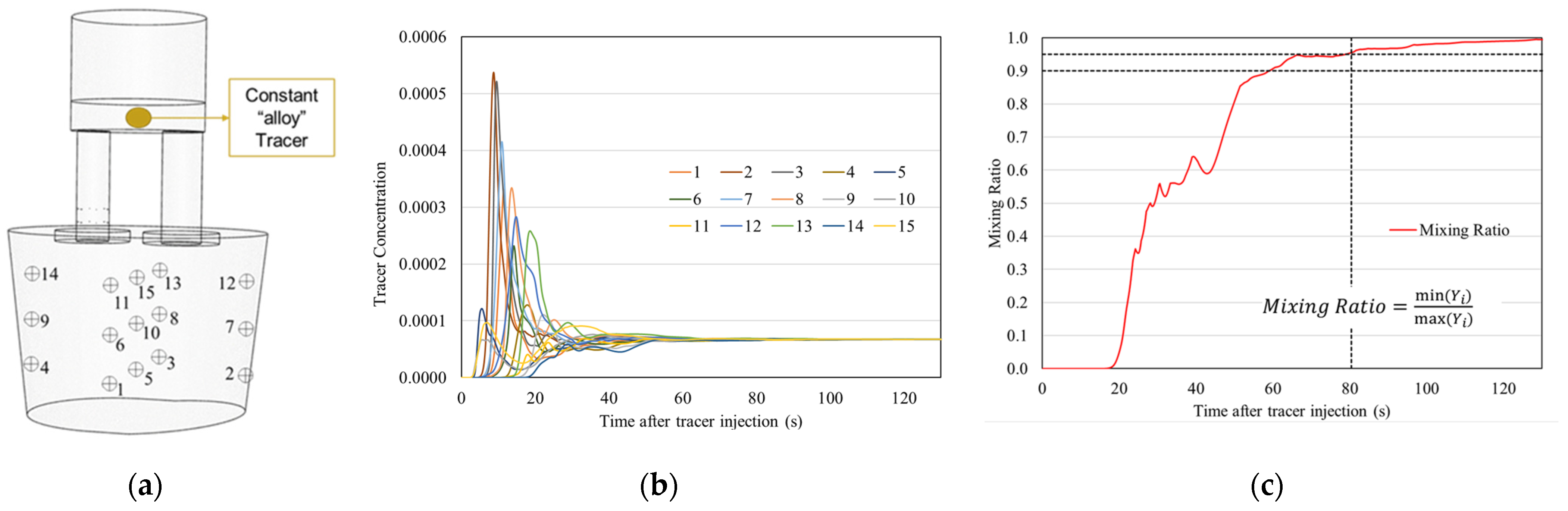 17]. This was followed by the development of a full-scale CFD model of an industrial RH degasser currently in operation. To evaluate the mixing efficiency across different flow rates, a commonly used metric known as the mixing time was utilized, where a shorter mixing time typically indicates a higher mixing efficiency [