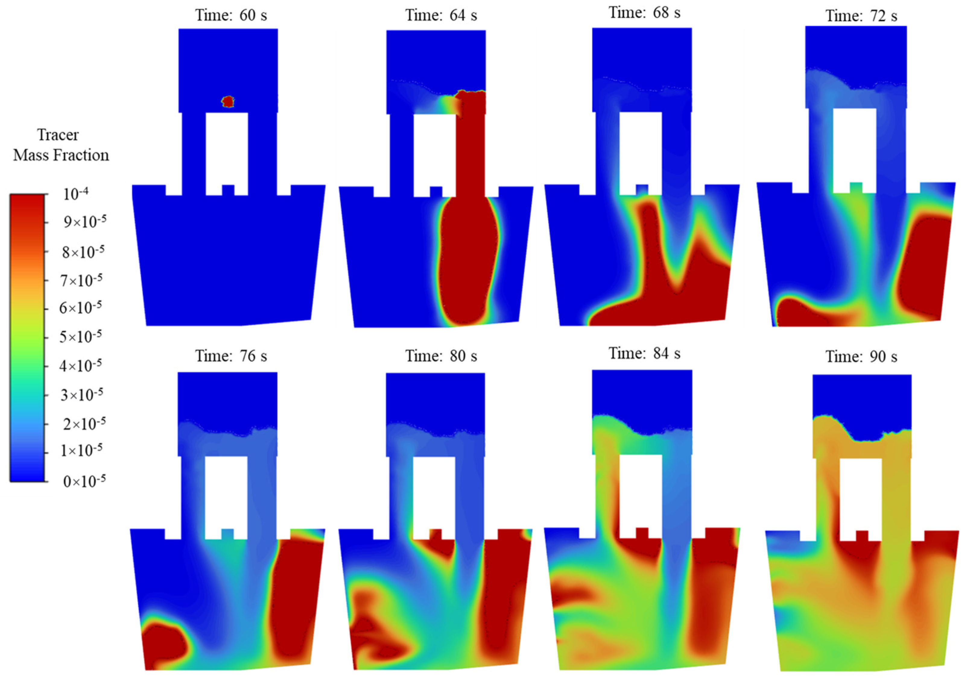 Figure 9 shows the tracer mass fraction throughout the system revealing how alloy spreads,