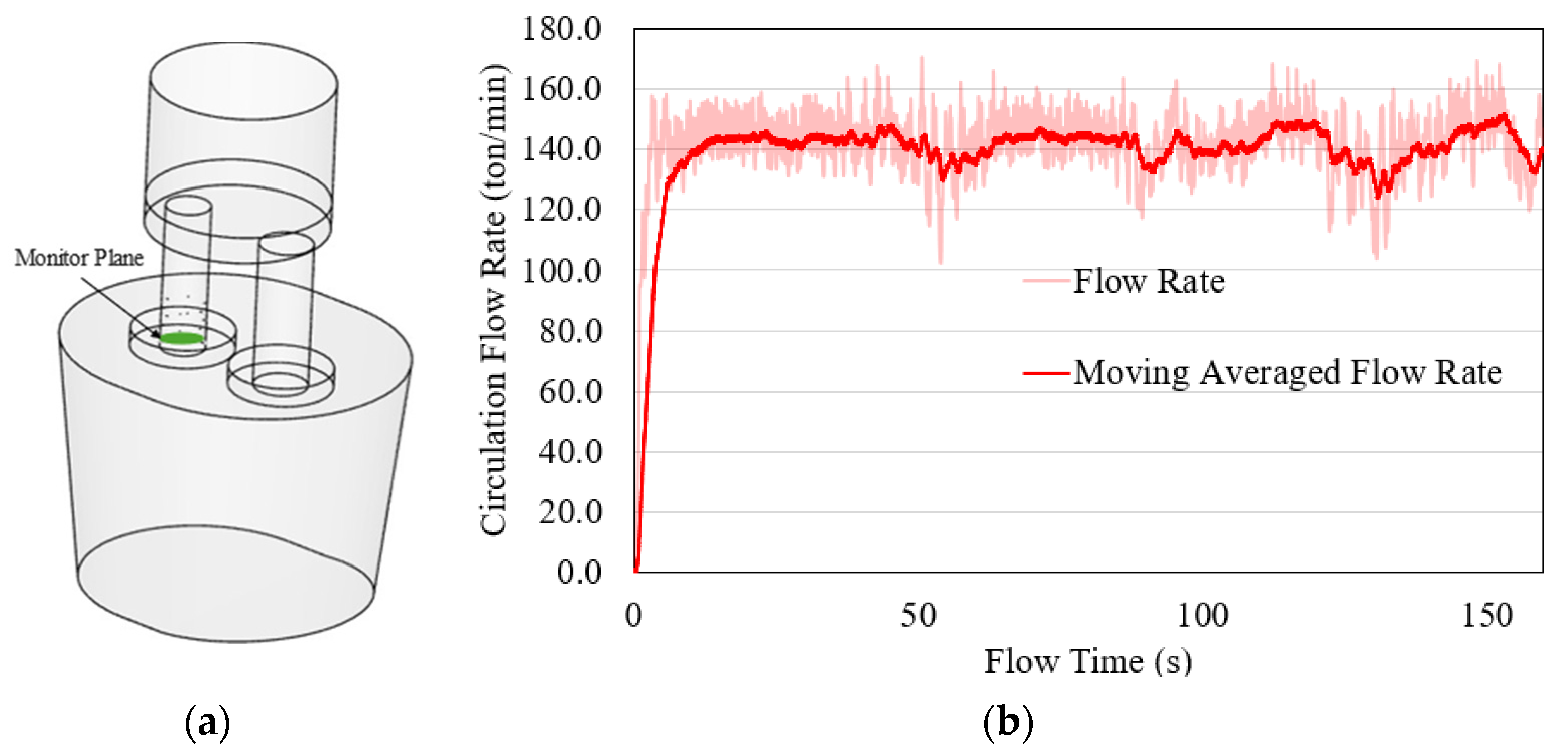 Circulation flow rate is defined as the mass of molten steel passing through the up-snorkel per second. As a key performance indicator of the degassing process, it must be measured at a location with minimal backflow or recirculation to avoid double counting. Therefore, based on the velocity vector results, the monitor plane for recording the flow rate was placed at the entrance of the up-snorkel, as shown in