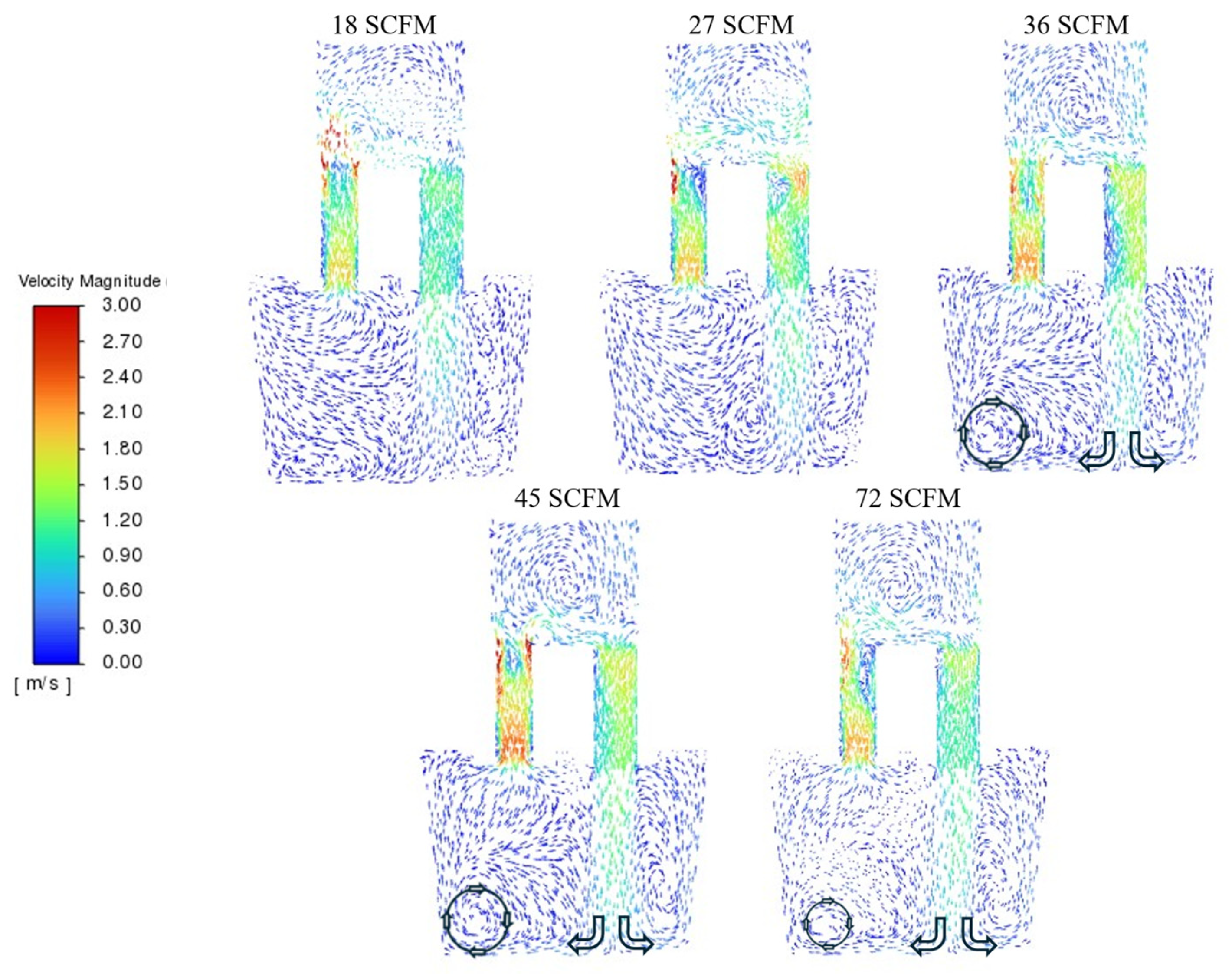 Figure 17. Saturation of the circulation flow rate and snorkel plane velocity beyond 36 SCFM can be attributed to the fixed entrance diameter of the up-snorkel, which limits the maximum volume of steel passing through. At this flow rate, the driving force of the injected gas is balanced by the resistance of the snorkel geometry, restricting any significant increase in circulation rates. The mixing time reaches its optimum at 45 SCFM, where gas injection sufficiently enhances internal flow circulations, ensuring rapid tracer dispersions throughout the ladle without creating excessive turbulence or zones of low circulation. Beyond this point, at 72 SCFM, the increased gas velocity induces additional flow circulation within the up-snorkel, preventing molten steel from fully occupying the steel volume and creating localized circulation zones. As shown in
