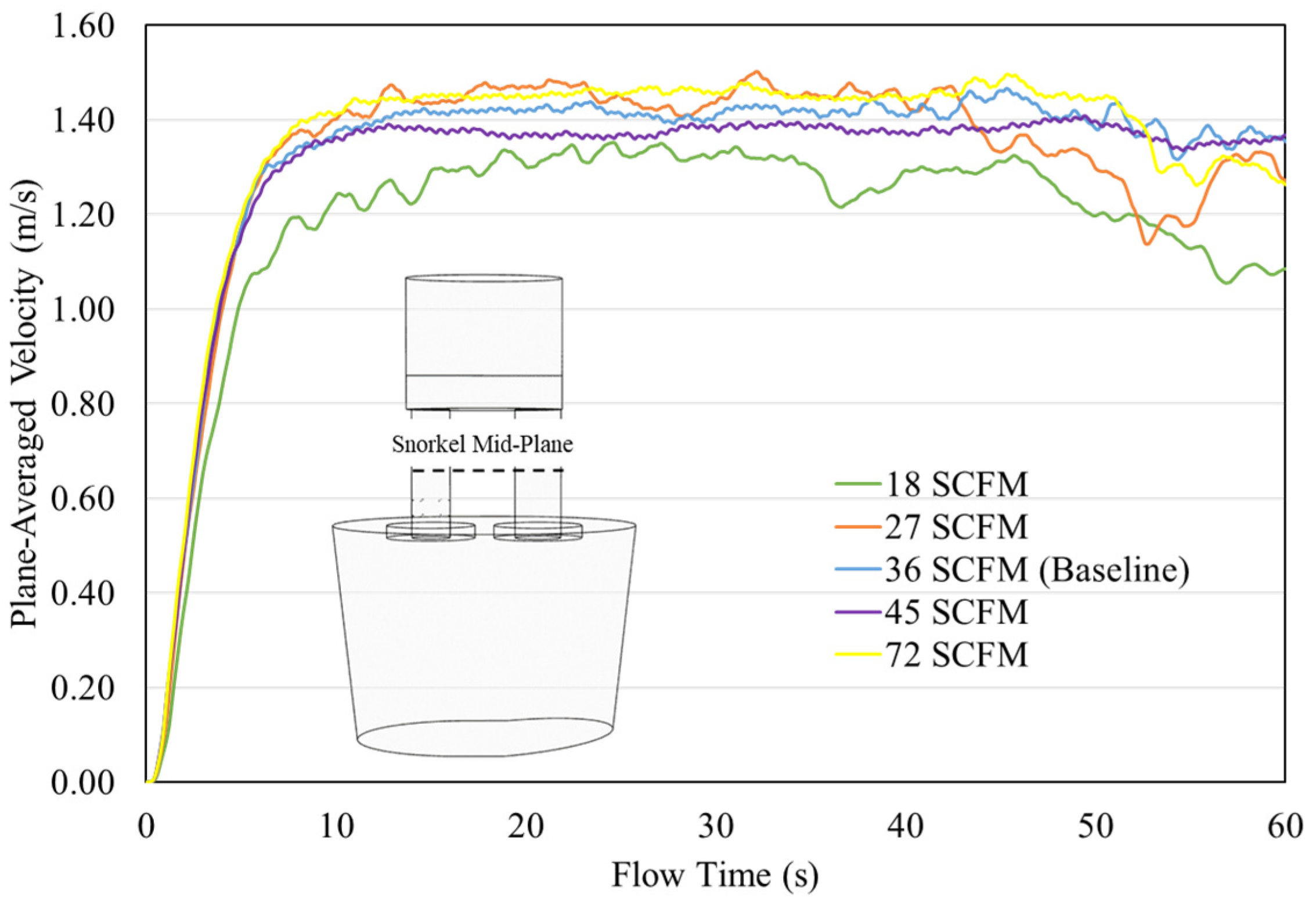 To examine the steel velocity for different cases, the plane-averaged velocity was recorded over a 60 s period. Since the highest velocities were consistently observed at the snorkel mid-plane for all cases, these velocities were compared across the different gas flow rates, as shown in