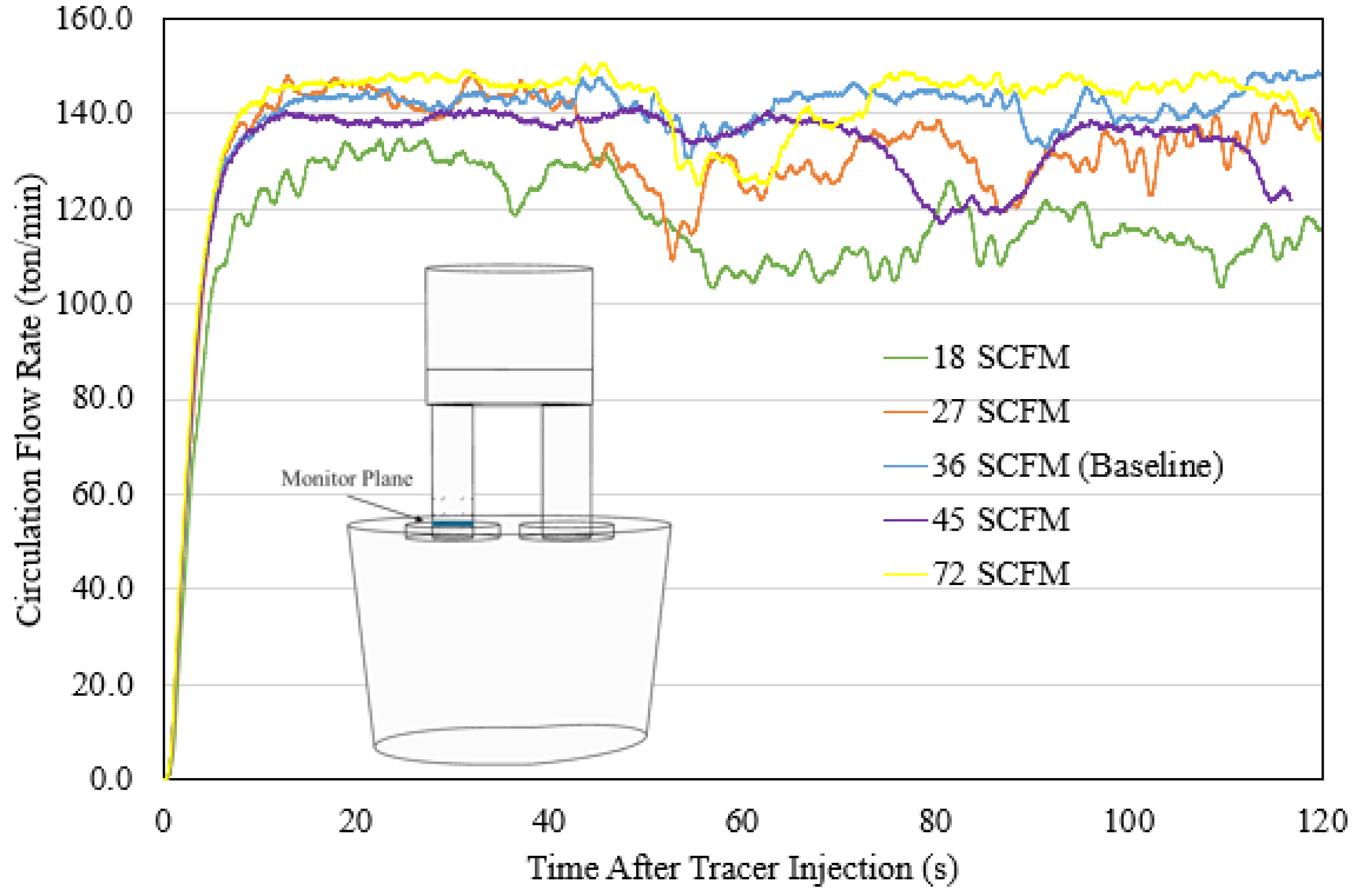 14] used a Eulerian–Eulerian CFD model to analyze circulation rates at higher gas flow rates (80 to 160 Nm