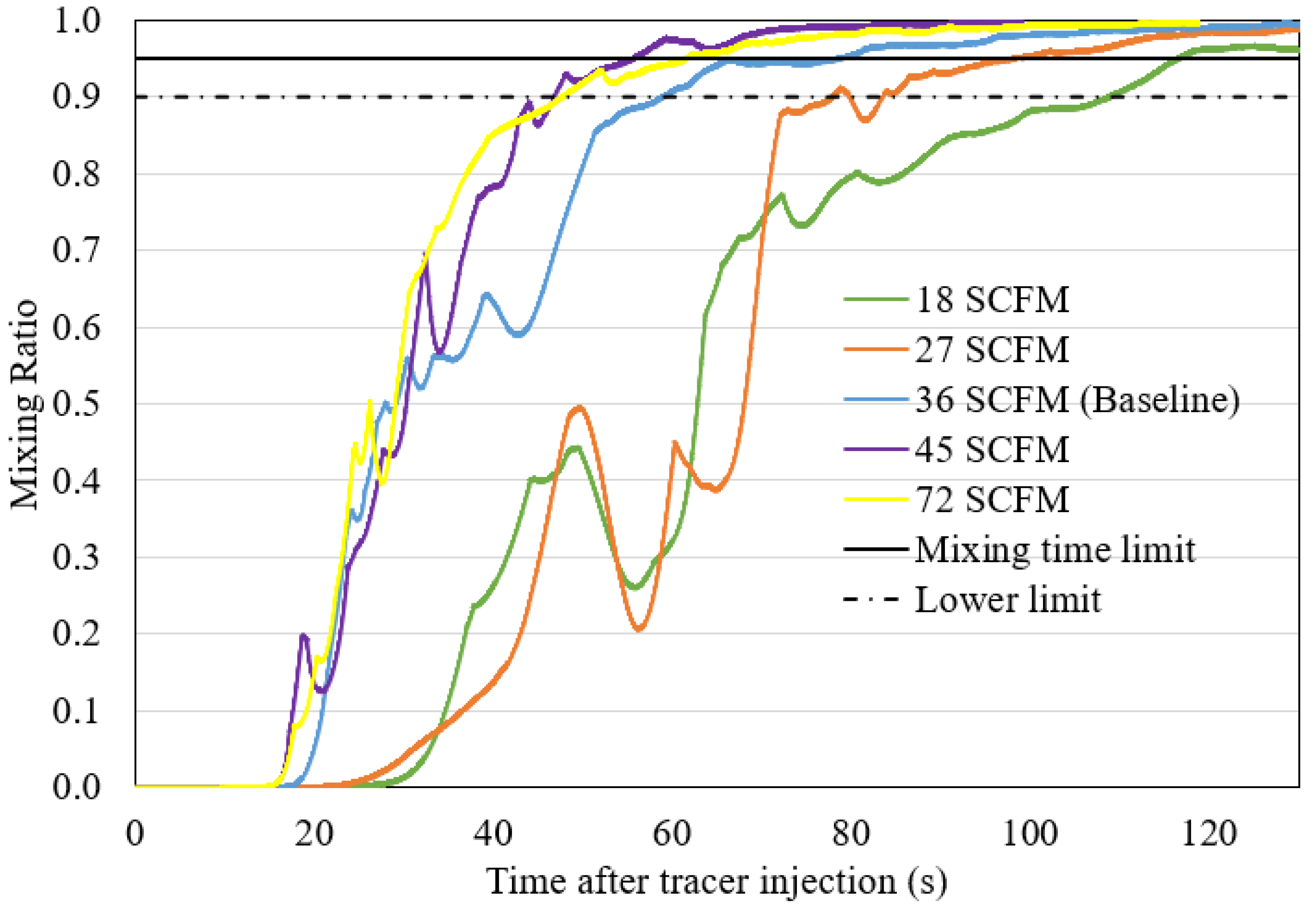 The mixing efficiency plots show that during the initial few seconds after tracer injection, the 18 and 27 SCFM cases behaved similarly, while the remaining cases exhibited similar behavior among themselves. After this initial period, the values began to diverge.