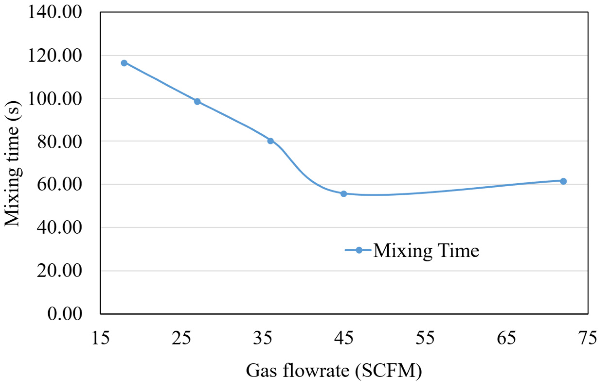 Figure 16. The highest mixing time (116.5 s), corresponding to the lowest mixing efficiency, was observed for the 18 SCFM case. In contrast, the lowest mixing time (55.7 s), representing the highest mixing efficiency, was recorded for the 45 SCFM case. Notably, the 45 and 72 SCFM cases displayed very similar mixing times and mixing ratios despite the substantial difference in their injection gas flow rates, indicating that increasing the flow rate beyond 45 SCFM had a minimal impact on further improving mixing time and efficiency.