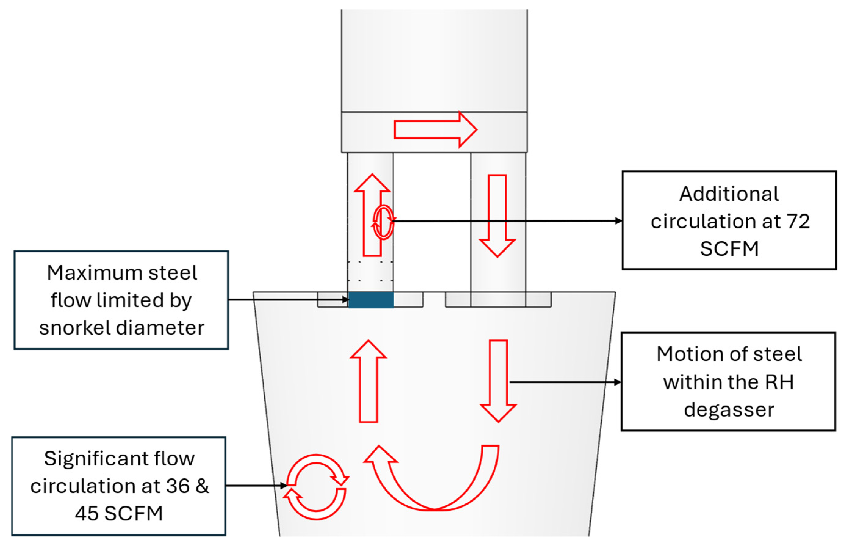 The direction of steel motion within the system as well as the flow circulation that impacts the mixing time and the geometric constraints leading to the saturation of circulation rate are shown in
