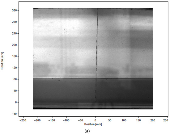 Flow characterisation was performed using planar Particle Image Velocimetry (PIV), providing both the mean velocity field and the standard deviation of the streamwise velocity component. The mean velocity map (Figure 4) clearly shows the influence of the plate on the incoming turbulent flow. Upstream of the plate, the average flow speed is approximately . In the vicinity of the plate, the flow is significantly decelerated, with local minima reaching about , indicating the relevant reduction in velocity due to the presence of the plate. Downstream, the velocity slightly recovers due to the small clearance left between the plate and the water tunnel walls to prevent flow blockage.