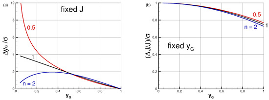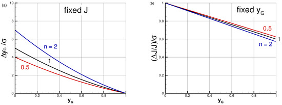 This equation is exact for and, in general, a good approximation for . We note that (44) is quite similar to the 2D counterpart (41); here, again, , and the decay with J of the last RHS term is also strong, at least as . The arguments presented for the 2D confinement effect can be repeated here. For a large J (strong influx), is close to 1, and as J decreases (weak influx), tends to 0. However, in the AXI system, is a singular point, and hence the transition to unconfined flow is assumed to occur at a small but finite . The typical value of for is for a fairly large range of n; see Figure 10. This supports the claim that l given by (37) is the typical thickness of the unconfined GC. For , the GC can be considered unconfined.
