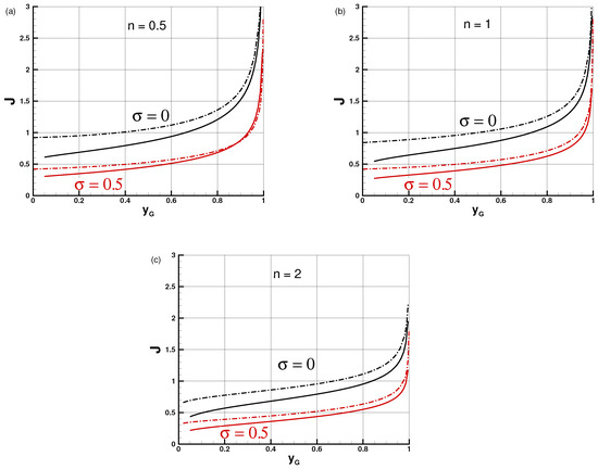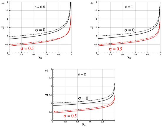 vs. J for the 2D systems with , and 2. We compare results of the lubrication model (solid lines) and box model (dash–dot lines) for two values of : 0 (black) and (red). We note that for a fixed n, the results of the models collapse into (almost) the same line for values of .