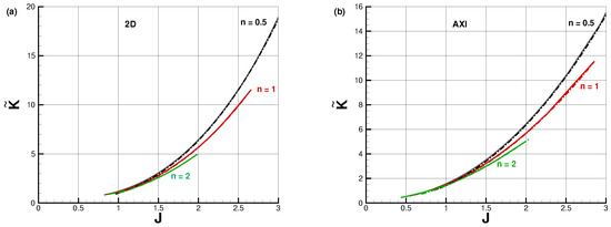 where for 2D and 3 for AXI. For given n, , and , we obtain the values of J and K in the confined GC. For , we recover the results of U25. The results of [8,10] are recovered for and AXI geometry (but note that these papers use a different scaling of the variables).
