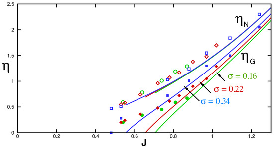 Table 1 of [8] provides values of the experimental and as functions of J for three different gaps H. Ref. [10], using available experimental values of the surface tension , pointed out that the three different gaps H also imply three different values of the parameter . The suggestion is to use the approximation in the models. Figure 4 of [10] shows the experimental points and vs. J (symbols), as well as the corresponding predictions (curves) of the lubrication model, which takes into account the surface tension effect.