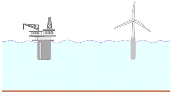 Spar platforms were first used in the oil industry as floating storage and offloading systems. A well-known example is the Devil’s Tower Spar, operated by Dominion Oil in 1710 m of water in the Gulf of Mexico. In September 1996, Oryx Energy deployed the first spar production platform in the Gulf of Mexico, demonstrating their feasibility for deep-water oil extraction [2]. Today, the same technology forms the basis of modern floating offshore wind turbines (FOWTs), linking traditional offshore oil exploitation with renewable energy generation. This transition is especially important because around 80% of the global practical offshore wind energy resource lies in waters deeper than 60 m [3]. Figure 1 shows typical applications of spar-type cylindrical hulls in both oil and gas platforms and floating wind turbines.
