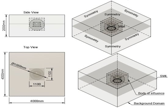 The computational domain was defined as a rectangular box of 4 × 4 × 2 m, with the spar buoy located at the middle (x ∈ [−2, 2] m, y ∈ [−1, 1] m, z ∈ [−2, 2] m). The domain contained approximately 1.2 million cells in total, as illustrated in Figure 5 below, which shows the domain geometry with symmetry boundaries and placement of the spar buoy. Boundary conditions were carefully implemented to replicate realistic open-sea conditions. The outer domain walls employed symmetry conditions that enforce zero normal velocity () and zero normal gradients for all flow variables (). This formulation creates a non-reflecting environment by preventing wave energy from reflecting back into the computational domain, which is crucial for accurate damping estimation. The buoy surface utilized a no-slip wall condition (), generating viscous shear stresses that contribute to the total damping. For the VOF model, symmetry boundaries maintained zero normal gradient for the volume fraction ), allowing the free surface to interact naturally with the domain extents [38].