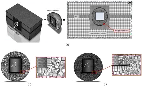 An overset (chimera) meshing strategy was adopted to accurately simulate the large-amplitude heave and pitch motions during free decay tests. The mesh system consisted of two distinct parts: a stationary background mesh encompassing the entire fluid domain, and a finer component mesh that moved with the spar buoy. Figure 6a provides an overview of this assembly, showing the overset region surrounding the spar and its overlap with the background domain. This approach maintains grid quality during rigid-body motion by allowing the component mesh to move freely through the background grid, with flow variables interpolated in the overlapping region to ensure solution continuity and numerical stability [38]. The background mesh consisted of approximately 0.9 million poly-hexcore cells, generated using Fluent’s Mosaic technology. The component mesh surrounding the spar was composed of roughly 0.3 million polyhedral cells. Figure 6b shows a close-up of the baseline configuration, highlighting the prism layers applied to the buoy surface. Eight prism layers with a growth rate of 1.2 were generated to resolve the viscous sublayer, with the first cell height set to maintain a y+ between 25 and 100, consistent with the requirements of the standard k-ε turbulence model. Figure 6c confirms this near-wall treatment was consistently applied to appendages, as shown for the solid plate [1,36].