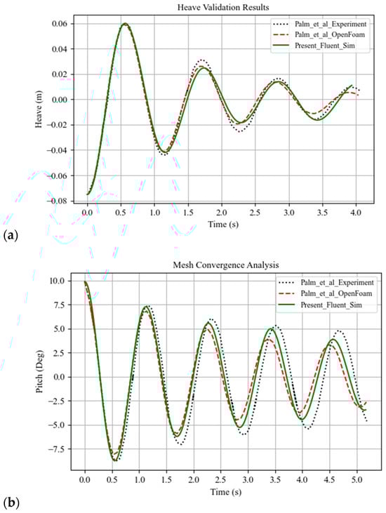 The present Fluent CFD validation results are shown in Figure 7a (heave) and Figure 7b (pitch), where they are directly compared to experimental and the OpenFOAM-based numerical results of Palm et al. [36]. Overall, there is good agreement of the present Fluent results with both experimental data and OpenFOAM-based reference simulations, which confirms the validity of the numerical methodology employed in this study. The heave response demonstrates close agreement with both reference datasets. As for pitch motion in Figure 7b, a slight deviation is observed between the experimental and numerical predictions, and this is consistent with the findings of Palm et al. [36], who attributed such discrepancies to small-scale experimental limitations, such as measurement uncertainties in draft and center of gravity positioning. Additional deviation between the Ansys Fluent and OpenFOAM results may stem from variations in numerical implementation schemes, such as pressure–velocity coupling, discretization order, and turbulence modelling strategies. Although both studies employed the k–ε turbulence model, their numerical implementation approaches differ. These solver-specific differences can influence transient decay predictions, particularly in pitch-dominated motions where damping is sensitive to overset mesh interactions and added mass representation.
