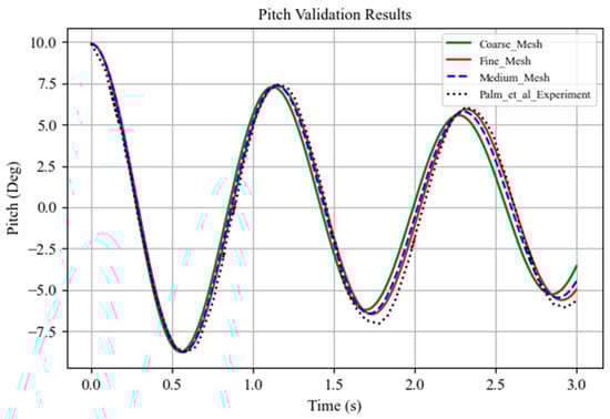 Mesh convergence study of the pitch free-decay response, presenting displacement (°) versus time (s) for coarse, medium, and fine grids, compared against the experimental reference data of Palm et al. [36].