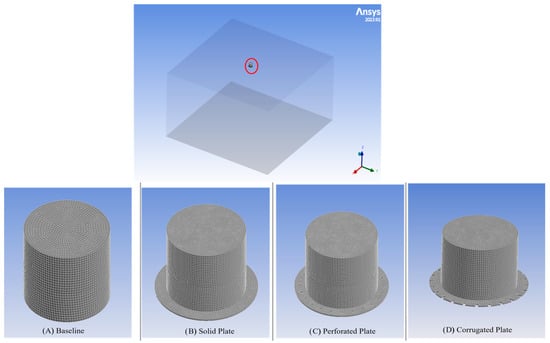Four spar cylinder configurations were examined using a consistent numerical model scale: (i) a bare (baseline) spar, (ii) a solid plate appendage, (iii) a perforated plate appendage, and (iv) a corrugated plate appendage. The Baseline, Solid Plate, and Perforated Plate are grouped as conventional appendages, similar to those examined in earlier studies, such as [1,5,18,19,25,26], and provide useful reference cases for comparison. In contrast, the Corrugated Plate introduces a new design concept, intended to improve damping by altering the surface geometry and increasing the plate edge perimeter. Figure 2 illustrates the spar cylinder along with the detailed geometries of all appended configurations.