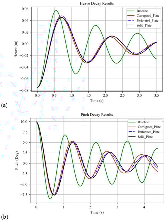 Figure 10 presents the free-decay curves and the detailed time histories, in Figure 10a (heave) and Figure 10b (pitch), together with the damping ratios in Table 2, which highlight the strong influence of the perforated plate. In heave, the damping ratio almost doubled compared with the baseline (ζ = 0.160 vs. 0.082), while in pitch it increased from ζ = 0.061 to 0.117. The corresponding total damping coefficient more than doubled, increasing from 59.95 to 138.41 kg/s. The corrugated plate achieved slightly higher heave damping than the solid plate (ζ = 0.154 vs. 0.144) but fell short in pitch (ζ = 0.105 vs. 0.116). The solid plate mainly lengthened the natural period, producing the largest frequency reduction (to 4.32 rad/s). In pitch, all appendage cases exceeded 2.0 kg·m2/s in total damping, well above the baseline value of 0.94 kg·m2/s. These comparisons underline that while every appendage improves damping, the perforated plate is the most efficient, the corrugated plate shows balanced behavior, and the solid relies more on inertia than on viscous dissipation.