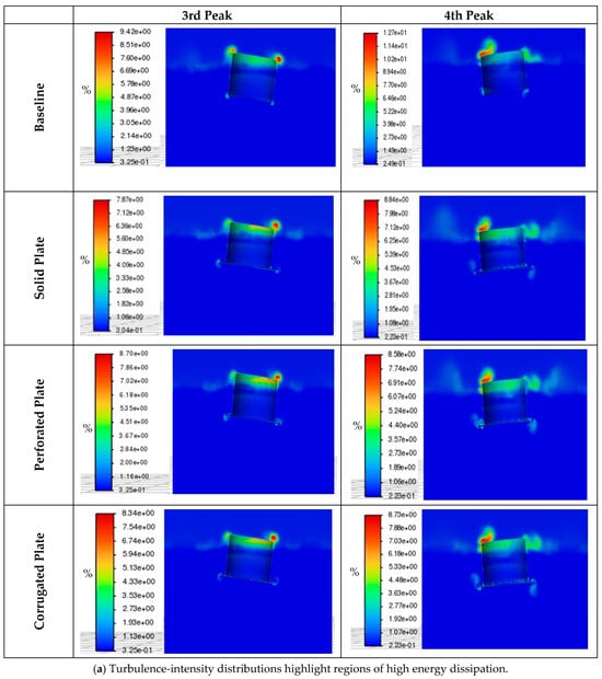 The flow fields in Figure 11a (turbulence intensity) and Figure 11b (vorticity) help explain these differences. In the baseline case, vortices were weak and turbulence stayed close to the cylinder base, so little energy was lost. By contrast, the perforated plate created fragmented vortices and intense turbulence around its openings, which explains its high viscous damping. The corrugated plate produced distributed vortices and wake turbulence, giving it intermediate performance. The solid plate drove broad recirculation and localized turbulence, but this mechanism depended more on added inertia than on dissipation. These flow patterns tie directly to the stronger decay rates seen in Figure 10 and Table 3.