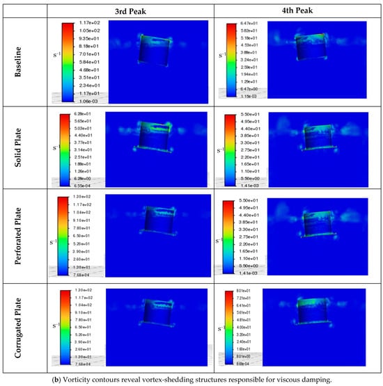 Figure 11b presents the vorticity contours at the same instants (3rd and 4th peaks). The baseline model shows weak, axisymmetric vortices near the cylinder base, while appendage-equipped cases, especially the corrugated plate, exhibit intense vortex structures and shear layers responsible for their enhanced viscous damping.