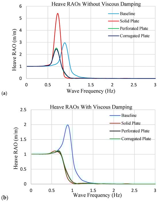 Heave Response Amplitude Operators (RAOs) of spar buoy configurations under regular wave forcing, comparing results with and without applied viscous damping coefficients. (a) RAOs without viscous damping (only radiation effects). (b) RAOs with viscous damping values derived from CFD-based free decay simulations.