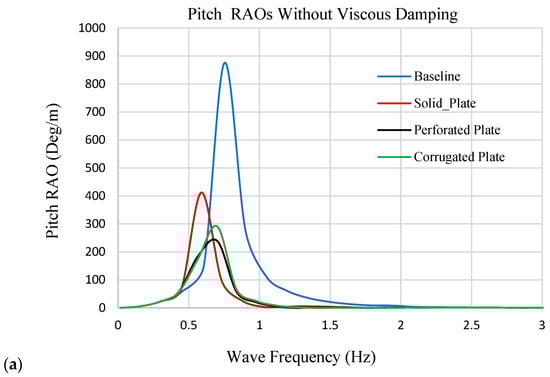 Pitch Response Amplitude Operators (RAOs) of spar buoy configurations, shown with and without the inclusion of viscous damping coefficients. (a) RAOs computed with no viscous damping; (b) RAOs computed using combined radiation and CFD-based viscous damping.