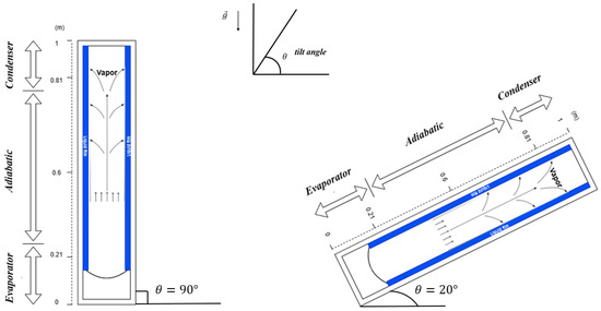 Figure 1 provides a schematic representation of the thermosyphon heat pipe (THP) investigated in this study together with the adopted coordinate system. The device consists of a sealed cylindrical copper tube charged with methanol, selected for its favorable thermophysical properties. (Other working fluids and tube materials are assessed later on.) To capture the role of gravity in the return of the condensate, the tilt angle of the THP was varied from 90° (vertical orientation) down to 20°.