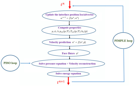 The simulations employ the PIMPLE algorithm, which combines the strengths of the PISO (Pressure-Implicit with Splitting of Operators) and SIMPLE (Semi-Implicit Method for Pressure-Linked Equations) methods. PISO focuses on pressure correction and momentum coupling, whereas SIMPLE introduces additional iterations to improve stability and ensure energy conservation. Therefore, the PIMPLE framework provides a robust solution for transient compressible multiphase flows with phase change. The iterative loop of this algorithm is illustrated in Figure 5, showing the sequence of interface updating, property calculation, velocity prediction, and pressure correction.