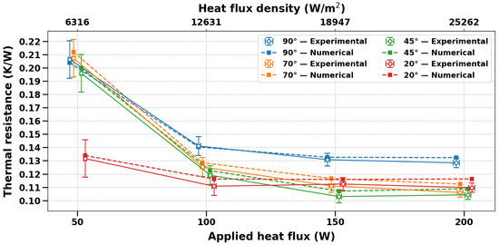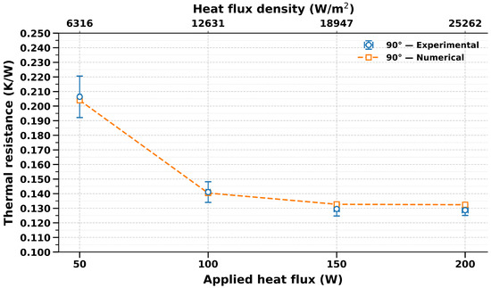 Validation tests were conducted at a vertical inclination (90°) with heat inputs of 50, 100, 150, and 200 W. Table 4 summarizes the comparison between experimental and numerical thermal resistances, while Figure 8 illustrates their variation as a function of the applied heat flux.