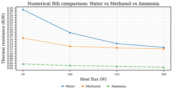 Ammonia performs best, with resistance decreasing from 0.057 K/W to 0.040 K/W as the flow increases from 50 W to 200 W. Methanol also shows a decrease in thermal resistance, from 0.165 K/W to 0.120 K/W, but with lower performance than ammonia. Finally, water shows the least favorable results, with thermal resistance varying from 0.282 K/W to 0.125 K/W over the same flux range.