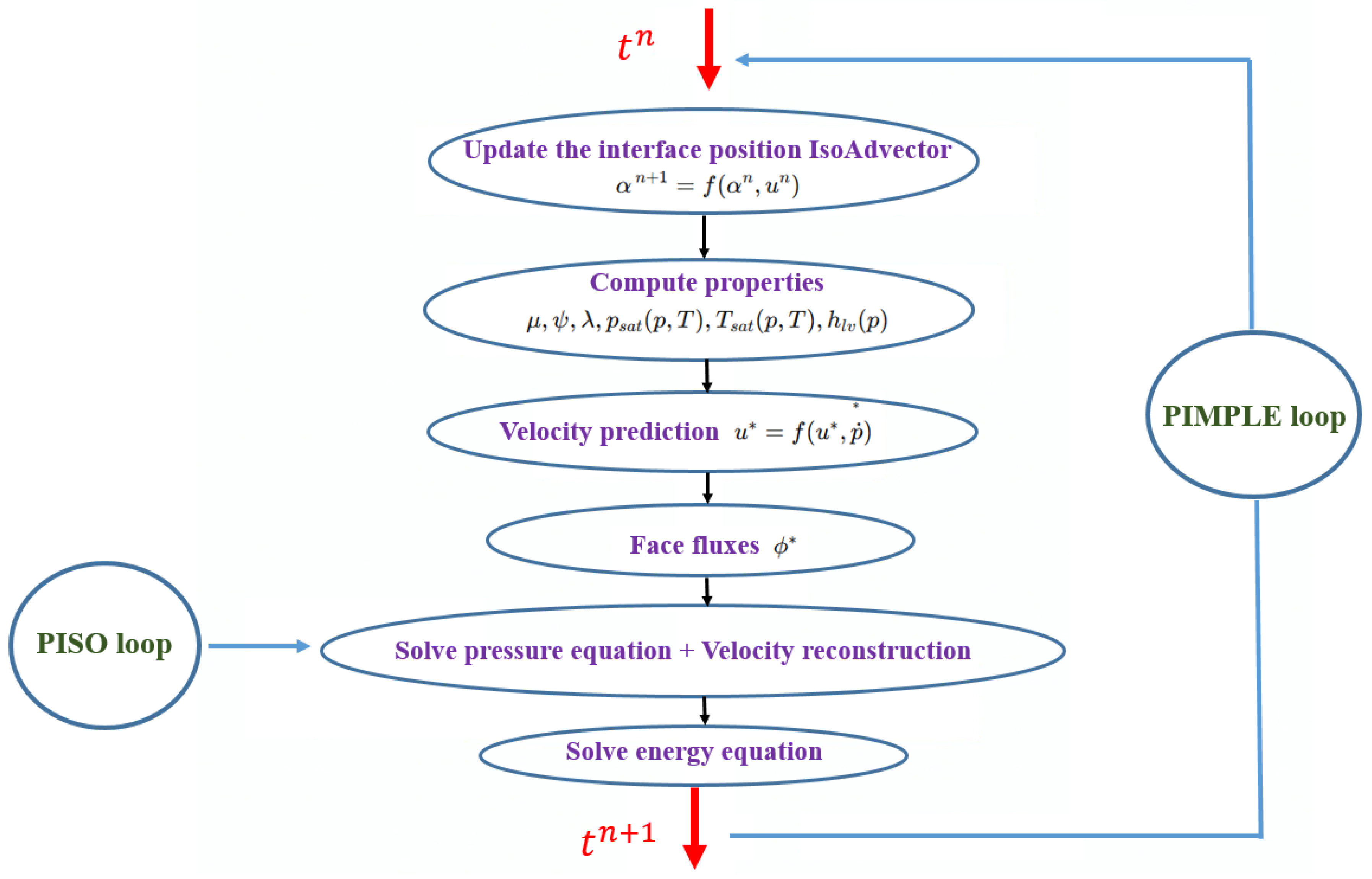 Phase-change modeling is often incorporated through source terms in the governing equations, linking interfacial mass, momentum, and energy transfer. The Schrage and Lee models [