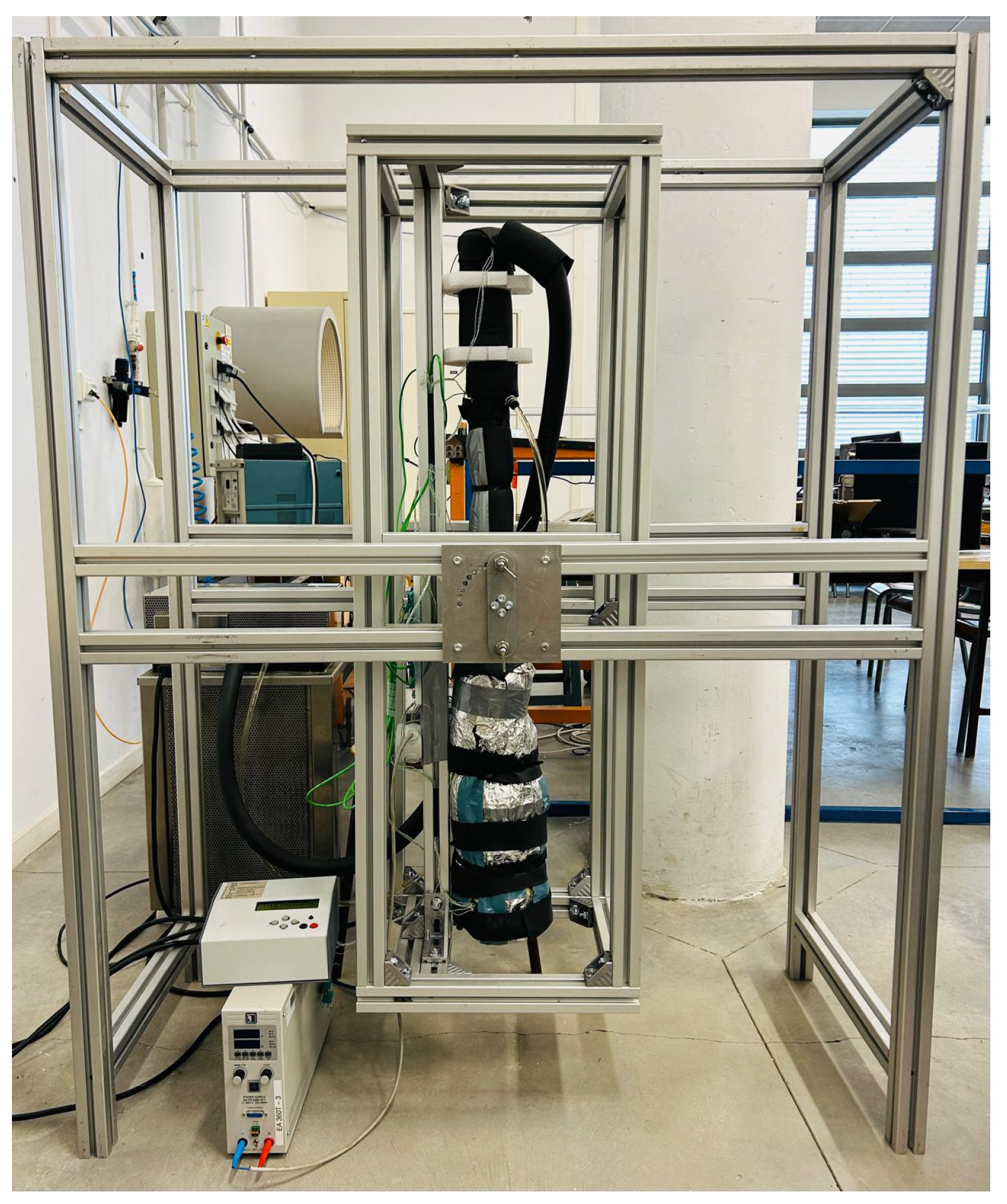 A particular contribution of this work lies in the design of a versatile experimental rig that incorporates an inclination adjustment system; this frame can be divided into two separate elements. The first is attached to the thermosyphon and consists of a modular frame made of T-slotted aluminum profiles, forming a rigid structure. Two horizontal crossbars support a front plate (for adjusting the angle) to which the insulated tube is securely clamped. The grooves in the profiles provide numerous anchor points for adjusting the height and alignment of the thermosyphon and facilitate the passage of cables, sensors, and hoses. This architecture ensures stability, accessibility, and modularity of assembly, while the auxiliary equipment visible at the base of the frame remains motionless and close at hand for power supply and thermal control (