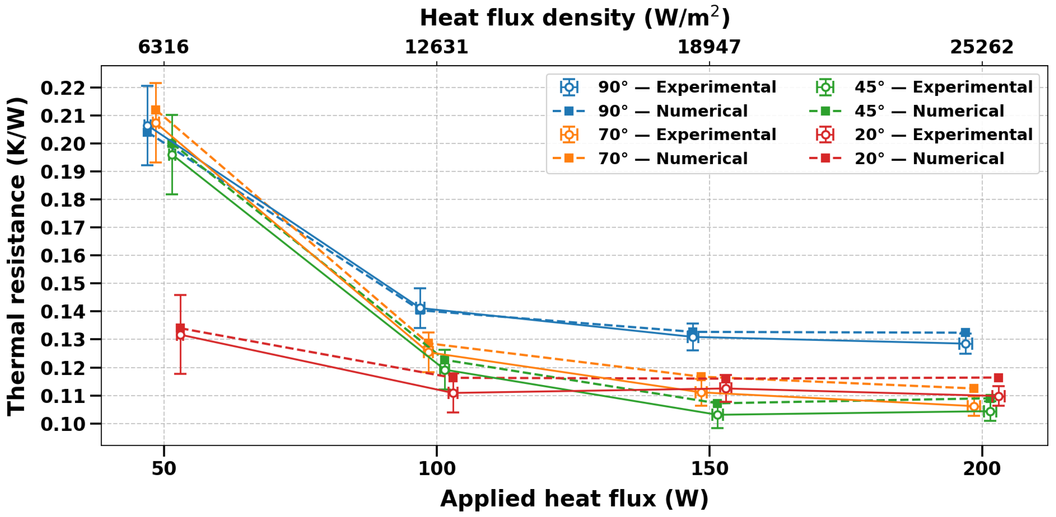 Table 4 summarizes the comparison between experimental and numerical thermal resistances, while