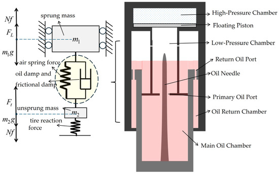 The nose landing gear shock absorber of a heavy fixed-wing carrier-based aircraft is simplified as a two-mass spring-damper system. The air, which is mainly used for energy absorption and barely dissipates energy, is simplified as a spring; the oil (for energy dissipation) and various friction-generating mechanisms are simplified as dampers [14]. The landing gear structure is divided into two lumped masses: sprung mass and unsprung mass.