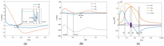 Shock Absorber Drop Test Performance Simulation Results. (a) Velocity of and ; (b) Displacement of and ; (c) Variation of each axial force within a single cycle.