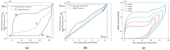 Similar to the buffer, the tire is also an important energy-absorbing component. Figure 5b shows the work-energy diagrams of the tire. Obviously, the damping force of the tire is much smaller than its spring force, and the work-energy change in the rebound phase tends to be linear. Both the tire and the buffer play a role in energy absorption. The compression stroke, peak load, and energy absorption efficiency are important indicators for evaluating their performance. The calculation method of energy absorption efficiency is as follows [24,25]: