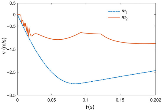 Figure 6 shows the variation in the extension speed of the upper and lower mass blocks under the conditions of a full-aircraft mass of 22.5 t, a final towing speed of 60 m/s, and a free taxiing distance of 12.5 m. The tire oscillation lasts only 0.025 s, indicating good performance.