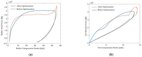 Comparison of Work-Energy Diagrams Before and After Optimization. (a) the optimization results of the buffer; (b) the optimization results of the tire.