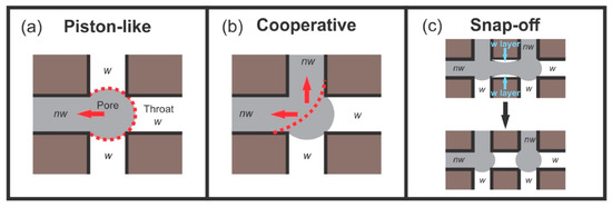 The dashed red line represents the position of the meniscus immediately prior to displacement (a) and immediately after displacement (b). (a) Piston-like displacement; (b) cooperative pore-filling, specifically an I2 displacement as two throats are filled with non-wetting fluid as the displacement occurs; (c) snap-off. “w“ represents the wetting fluid and “nw” represents the non-wetting fluid. The red arrows indicate direction of flow. The blue arrows indicate the direction of movement of the meniscus. Reprinted from [7]. Copyright (2024), with permission from Elsevier.