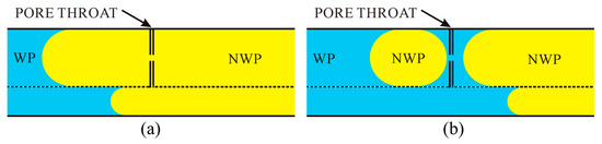 Simple straight pore models can also be used to consider dynamic effects. A relatively simple interacting capillary bundle developed by Dong and co-workers [31,32] has been used to explain the large difference in the levels of entrapment of nwp during co-current spontaneous imbibition of packed beds of glass beads or quartz sand [33]. The key difference in the void space of the two packed beds was the pore size distribution (PSD). While the PSD for the glass beads was narrow, that for the sand was much wider. The original interacting capillary bundle model consisted of a bundle of parallel tubes of different diameters where communication and pressure equilibration between tubes is possible at every position along the long axis of the tubes. However, Meng et al. [33] made a further modification of the basic interacting capillary bundle model to include a very narrow pore throat within a larger tube, as shown in Figure 4. In general, the theory predicts that for porous media with a wide PSD, during immiscible displacement, the meniscus boundary between nwp and wp advances faster in smaller pores than larger pores. Hence, for the capillary bundle with the throat added, when the meniscus in the smaller pore reaches the equivalent position of the pore throat in the larger pore, the pore throat will rapidly fill with wetting phase from the smaller pore because the curvature of the pore throat is large and its volume is relatively small. This will result in snap-off of the nwp in the larger pore, as seen in Figure 4b. Hence, nwp may become entrapped in the larger pore if there are no further interconnections with other tubes into which the nwp could escape. For void spaces with narrower PSDs, such as glass bead packing, the advancement rate of menisci in different pores is virtually the same, such that the imbibition front is almost flat, and the situation in Figure 4 rarely arises. This model can also explain why the level of entrapment is often observed to increase with nwp viscosity. This is because the difference in the advancement rate of the menisci in the smaller and larger pores increases with increased nwp viscosity. Hence, it means the situation seen in Figure 4b may arise more frequently and, thus, more entrapment results. These findings suggest that a relatively simple capillary model can explain many of the dynamic features of entrapment in fairly complex void spaces.