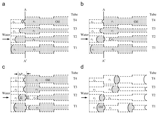 Schematic diagram of the stages (a–d) of the trapping of oil occurring in an interacting-serial-type triangular tube bundle model. Reprinted from [34]. Copyright (2011), with permission from Elsevier.