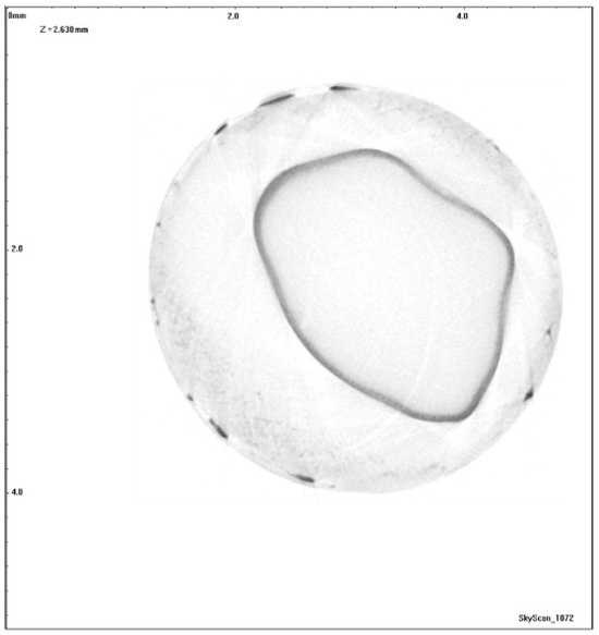 The type of entrapment shown for the interacting capillary model in Figure 5d, where the nwp occurs as a short band at the narrowing of the pores, may be what is occurring during mercury retraction from a sol–gel silica pellet—where computerised X-ray tomography (CXT) has shown a shell of mercury (appearing as a ring in the 2D cross-section in Figure 6), probably where the seed particle forming the core of the pellet bounds the mantle of new silica added in the so-called “oil-drop” synthesis method typically used for forming such materials [11]. The sol–gel silica has a disordered, interconnected, mesoporous network. However, the whole spherical shell-like boundary seen in the CXT image may be associated with a particular narrowing of the pore size, due to the blinding-off of pores on the exterior of the core region during precipitation of further silica in the mantle. This is supported by the fact that the entrapment disappears entirely when the pellet is fragmented to a powder with particle sizes smaller than the core region, since the pore-shielding from the narrowed pores, giving rise to the entrapment, is then removed. However, an alternative hypothesis is that the entrapment arises within a band of larger pores sandwiched between core and mantle regions both composed of smaller pore sizes.