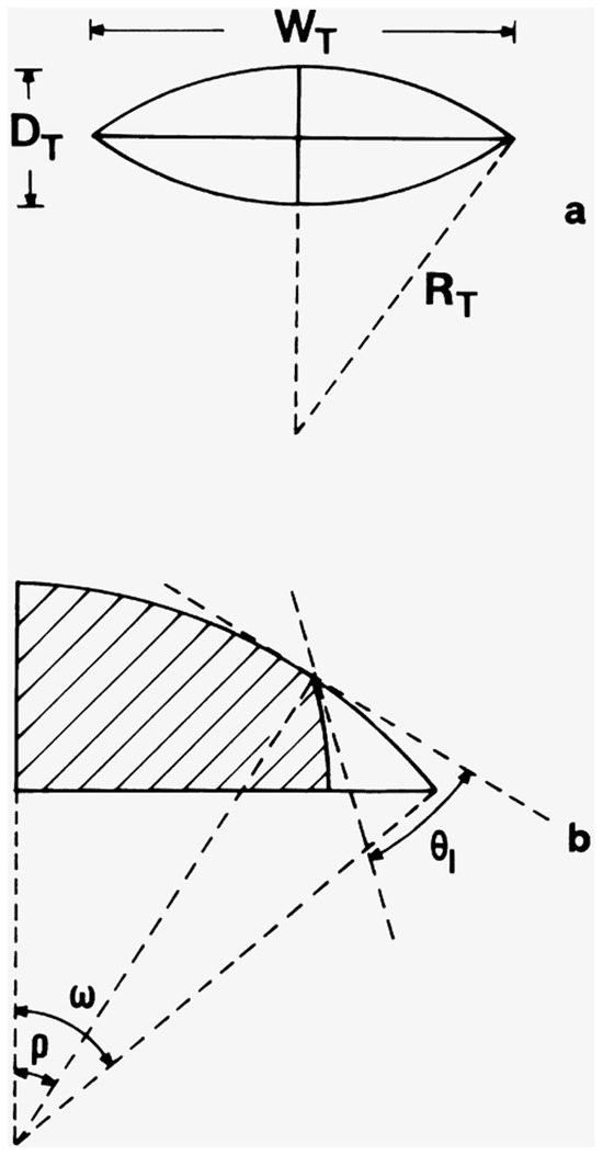 (a) Cross-section of a lenticular throat of the mathematical model. (b) Cross-section of a meniscus in a lenticular throat. The shaded region represents nwp and the corner is occupied with wp. The symbols denote various dimensions and parameters of the throat and meniscus. Reprinted from [37]. Copyright (1998), with permission from Elsevier.