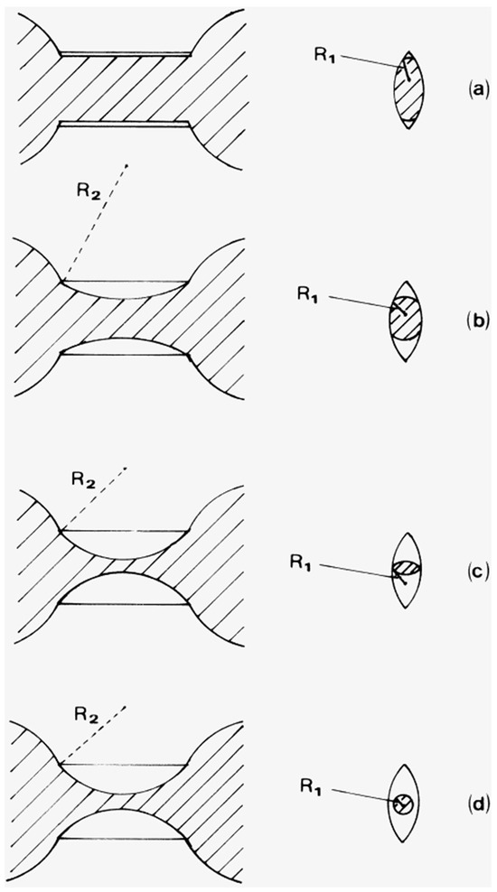 Consecutive stages (a–d) of snap-off in a lenticular throat connected with two chambers. The shaded region represents nwp. Reprinted from [37]. Copyright (1998), with permission from Elsevier.