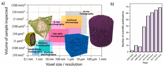 (a) Classification of various tomographic imaging methods of significance for research in porous media, according to their spatial resolution and their volumetric sampling capacity. (b) Evolution of the number of scientific publications applying FIB-SEM tomography for investigations in the area of (electro)catalysis. Reprinted from Catalysis Today, Vol. 405–406, Rodenas, T. & Prieto, G., FIB-SEM tomography in catalysis and electrochemistry, p.2 [53], Copyright (2022), with permission from Elsevier.