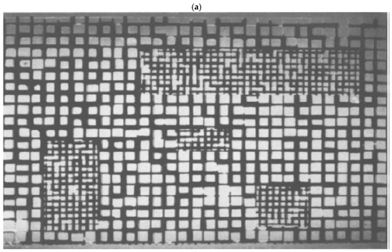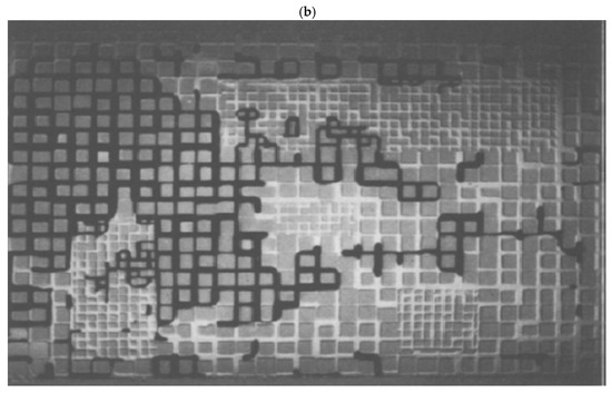 For such materials, it is possible to use the MRI data to construct a PNM consisting of a 2D or 3D grid of sites where each site consists of a pore bond network with pores of a size corresponding to that obtained from the NMR relaxation time for an individual voxel of the MR image itself. Hence, the MRI-derived computer model constructed had some similarity in form to the square grid glass micro-models constructed by Wardlaw and McKellar [30] where rectangular regions of network consisting entirely of larger pores were located within a wider network of smaller pores, as shown in Figure 12.