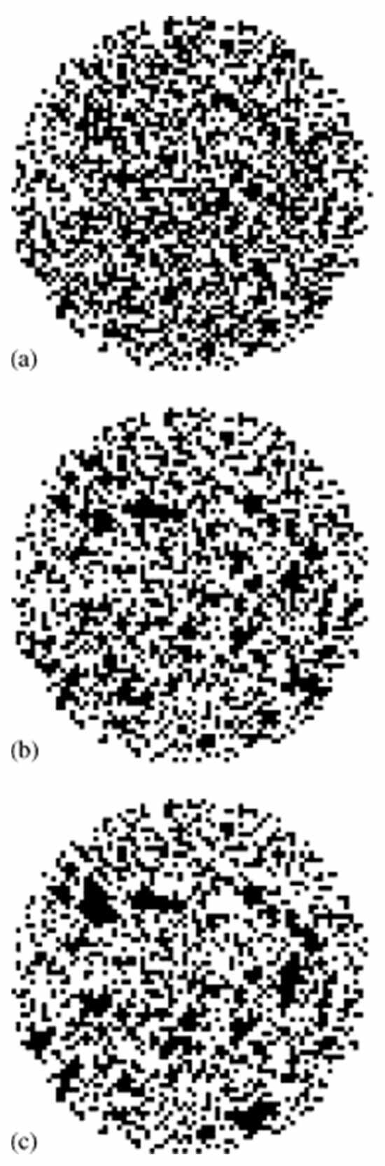 The variation in the spatial arrangement of entrapped mercury (black pixels) with SOR ((a) SOR = 1, (b) SOR = 1.5, and (c) SOR = 2) for simulations of mercury porosimetry on models constructed from NMR images of an “equatorial” slice from a typical pellet taken from batch G2. The pellet diameter is ~3 mm and the pixel resolution is 40 μm. Reprinted from [68]. Copyright (2006), with permission from Elsevier.