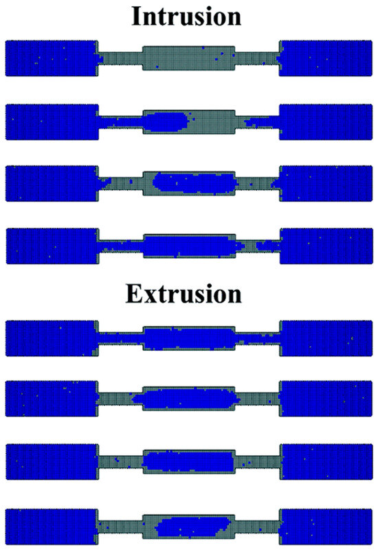 In the simplest PNMs—such as that of Mann and co-workers [24,25] and that of Dias and co-workers [26,27], which employ a pore bond network consisting of smooth, straight cylinders meeting at volume-less nodes—a small set of rules is used to describe the retraction. Since nwp is assumed to end the invasion process with a pair of free (uncoalesced) menisci within the smallest pore of the network, retraction is initiated from there. Retraction generally occurs only when a pore bond has a free meniscus at one end, when that pore bond maintains a continuous connection to the exterior only via pore bonds filled with nwp, and when the applied pressure also drops below the critical value (as from the standard Washburn equation [24,25,26,27]). In the models of Mann and co-workers [24,25] and of Dias and co-workers [26,27], when the meniscus reaches a new node all pore bonds attached to that node are considered to have a free meniscus. Hence, the initial retraction from the uncoalesced menisci would create six new free menisci at the entrances to the six adjacent pores in a square grid network of connectivity equal to four. In such a system, entrapment arises from the situation when a pore bond ends up with a free meniscus at both ends. Similarly, a cluster of pores all filled with nwp can become disconnected if all the bonds on the periphery of the cluster have free menisci. In a macroscopically homogeneous system (where the overall sample size exceeds the correlation length for average pore size), with an underlying random distribution of pore sizes across the network, mercury entrapment arises across the whole network. The amount of entrapment increases as the overall size of the network increases, and as the coefficient of variation in the pore size distribution increases. In tests of the model of Androutsopoulos and Mann against experimental data, the level of mercury entrapment was not predicted accurately; however, this may be due to the restriction of the model to a two-dimensional (2D) square grid with fixed connectivity [24].