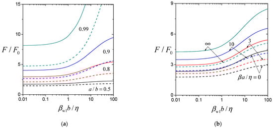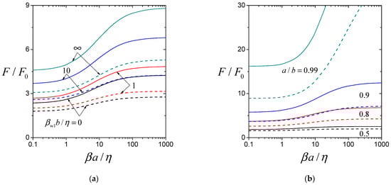Normalized drag force on a slip sphere translating perpendicular to two equally slippery and distant planar walls ( and ) versus the wall stickiness parameter : (a) with as a parameter; (b) with as a parameter. The dashed curves describe the corresponding translation perpendicular to a single planar wall () for comparison.