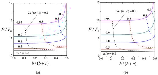 Normalized drag force on a slip sphere translating perpendicular to two equally slippery and distant planar walls ( and ) versus the length ratio : (a) with as a parameter; (b) with as a parameter. The dashed curves describe the corresponding translation perpendicular to a single planar wall () for comparison.